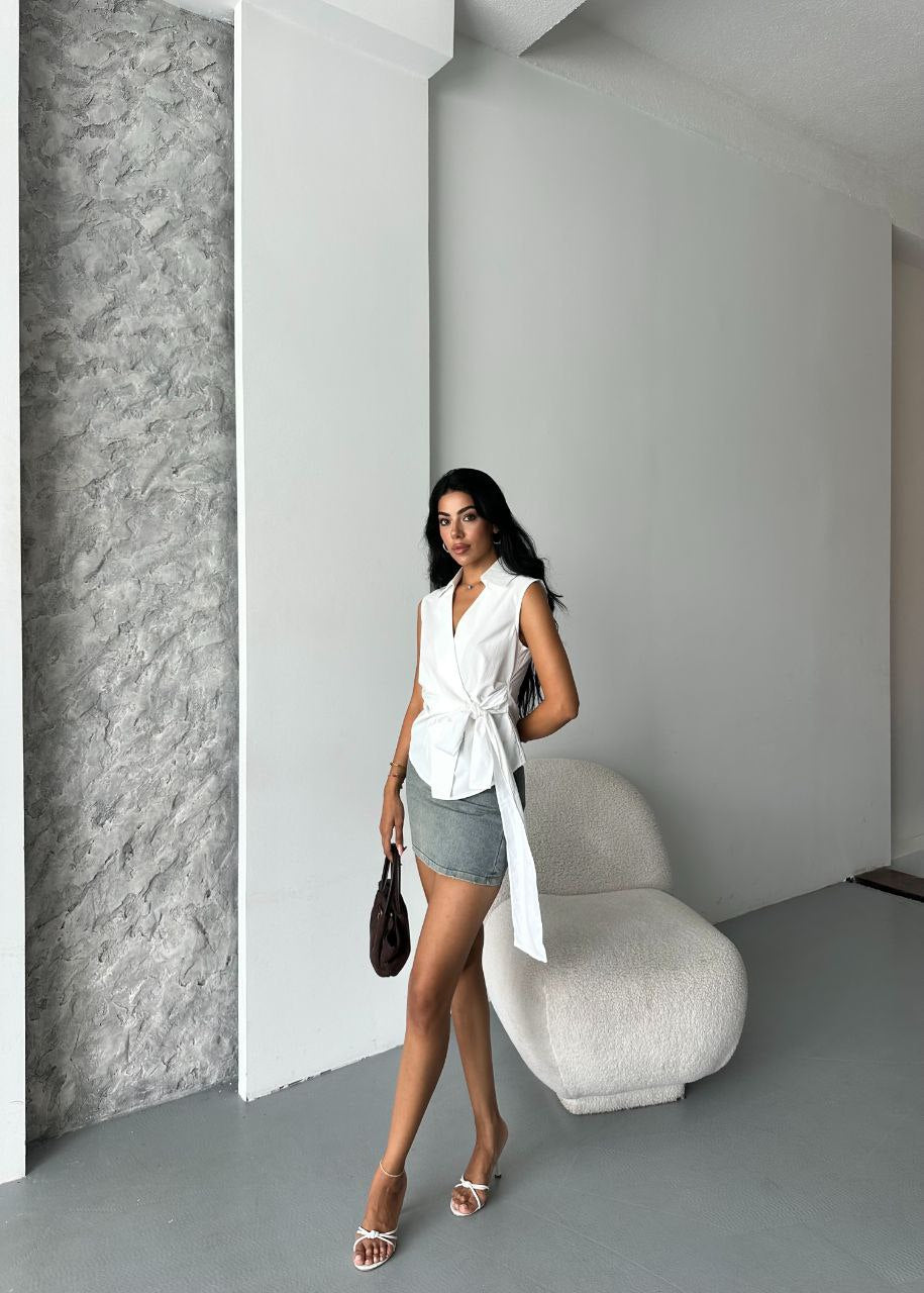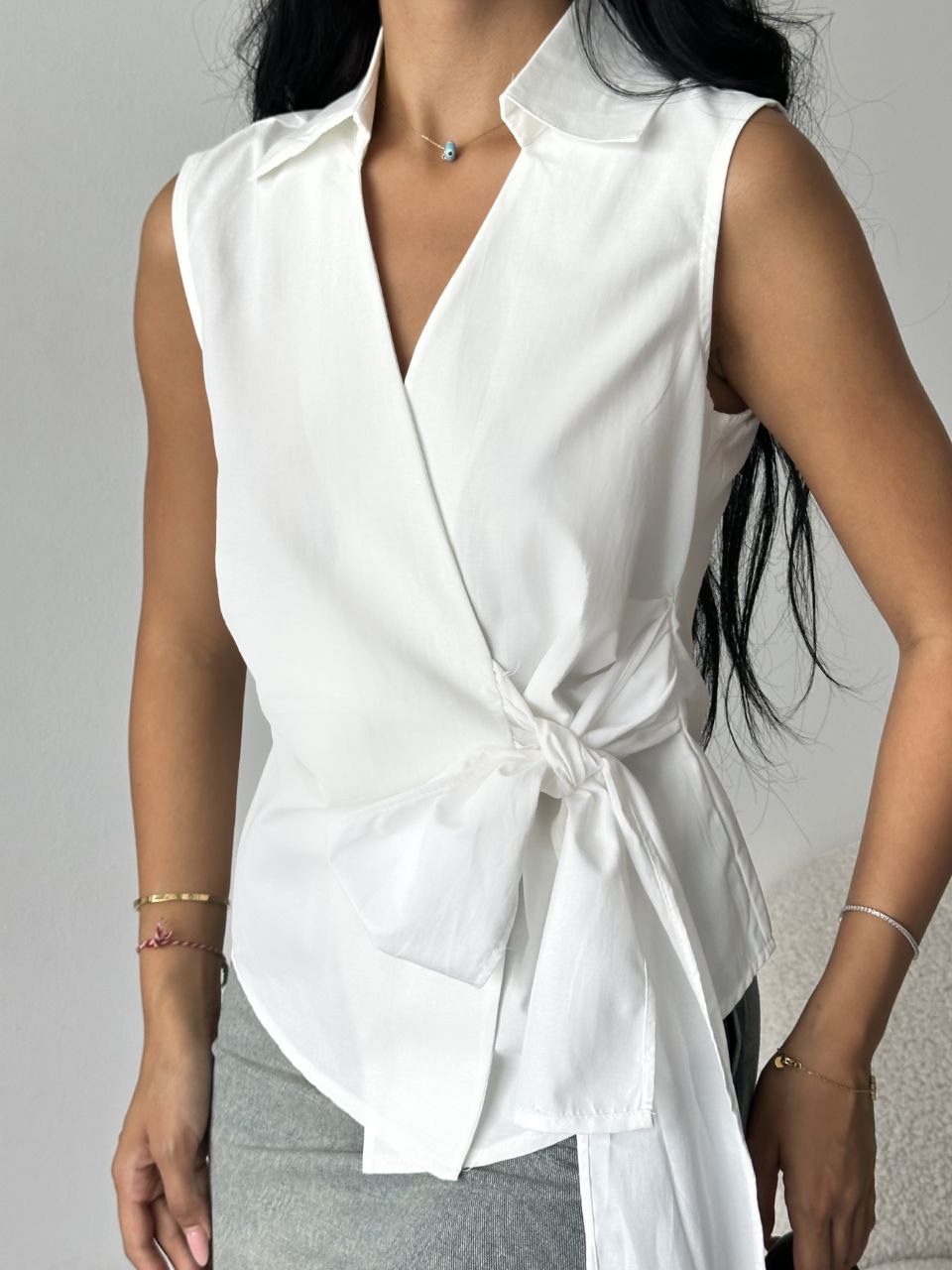Fiyonklu Kolsuz Gömlek - Beyaz