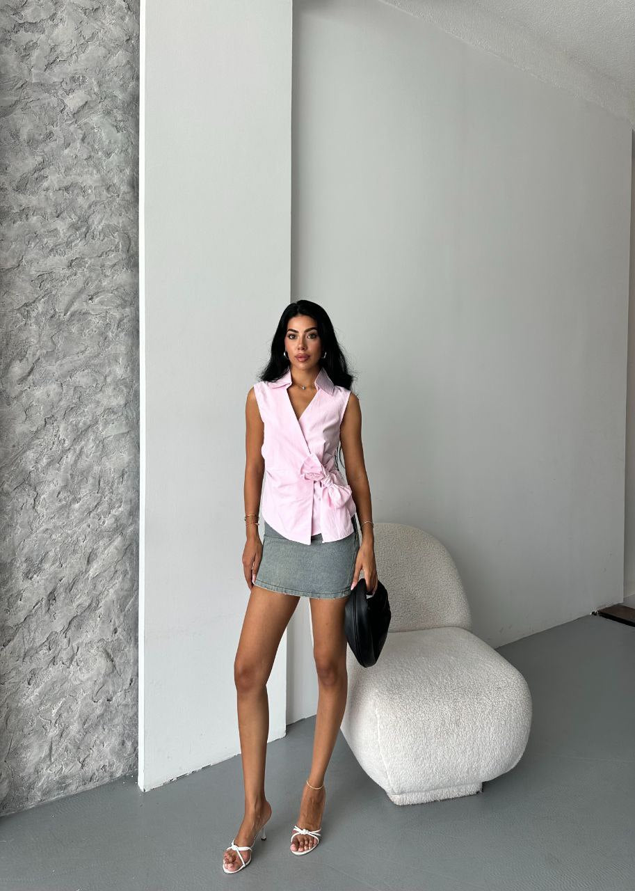 Fiyonklu Kolsuz Gömlek - Şeker Pembe